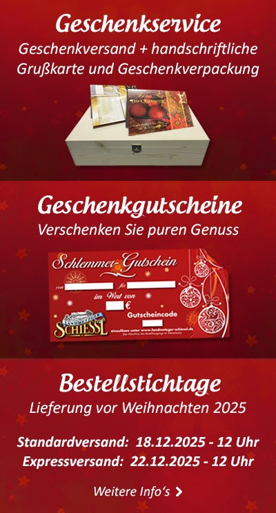 Wer Fleisch und Wurst im Internet bestellen möchte, der ist im Onlineshop der Landmetzgerei Schiessl genau richtig. Das Sortiment umfasst alles was Herz von Wurst und Fleischliebhabern höher schlagen lässt. Alle Spezialitäten werden nach traditionellem Fleischerhandwerk hergestellt. Besonders hervorzuheben ist, dass unsere Produkte nach altüberlieferten Rezepturen und aus hochwertigen Zutaten hergestellt werden, was sich im Geschmack der Produkte widerspiegelt.